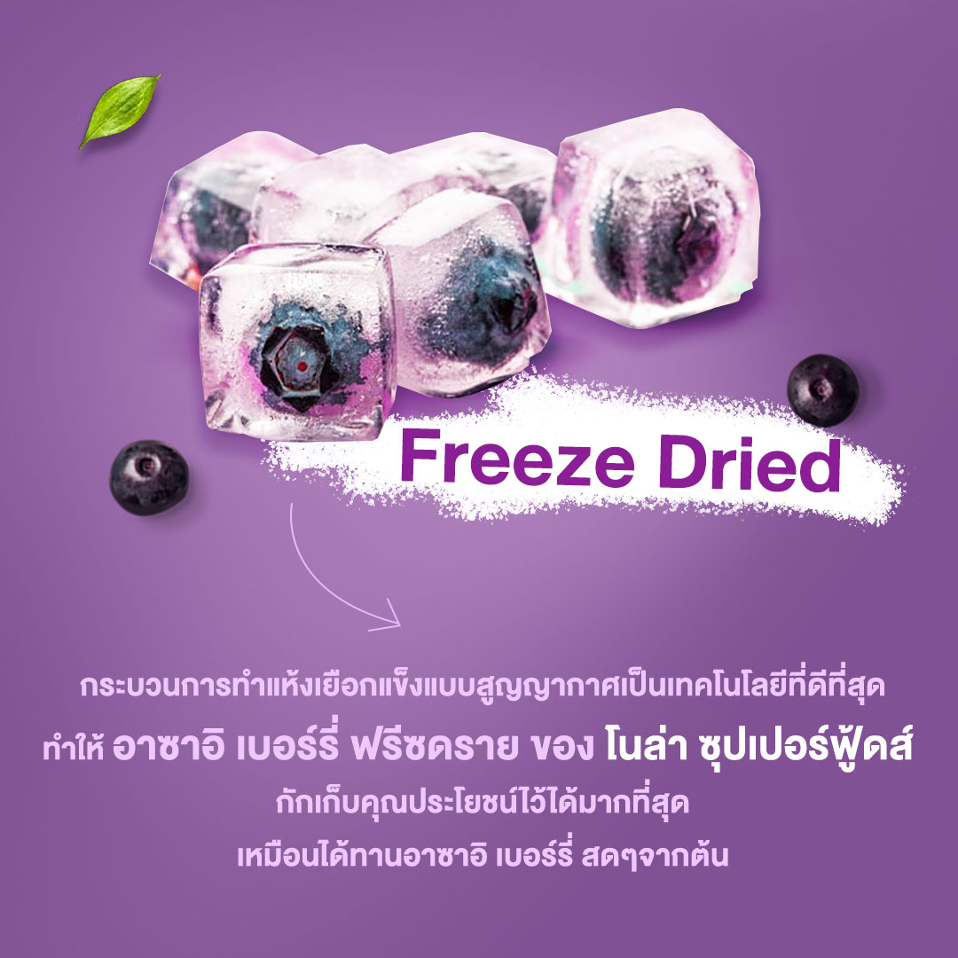 คือ กระบวนการทำแห้งเยือกแข็งแบบสูญญากาศเป็นเทคโนโลยีที่กล่าวได้ว่าดีที่สุด เนื่องจากระหว่างกระบวนการผลิตนั้นไม่มีการให้ความร้อนกับตัวอาหาร เพียงแต่อาศัยหลักการนำน้ำออกจากอาหารเท่านั้น จึงทำให้อาหารที่ผ่านกระบวนการฟรีซดรายจะมีคุณสมบัติในการคงคุณค่าทางโภชนการของอาหารได้อย่างครบถ้วนมากที่สุด ฉะนั้น อาซาอิ เบอร์รี่ ฟรีซดราย ของโนล่าซุปเปอร์ฟู้ดส์ จึงเป็นผลิตภัณฑ์เสริมอาหารที่คงคุณประโยชน์ของอาซาอิ เบอร์รี่ ไว้ได้มากที่สุดนั่นเอง