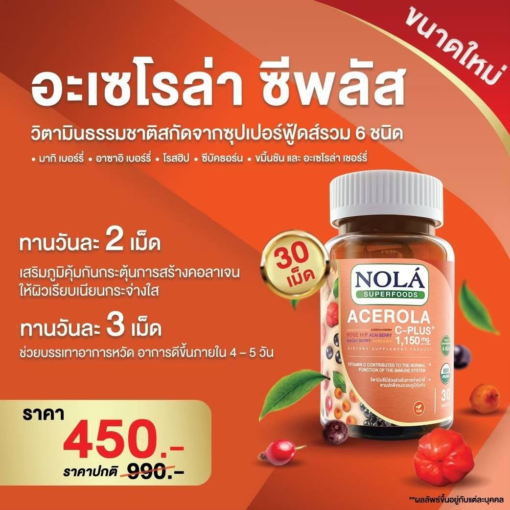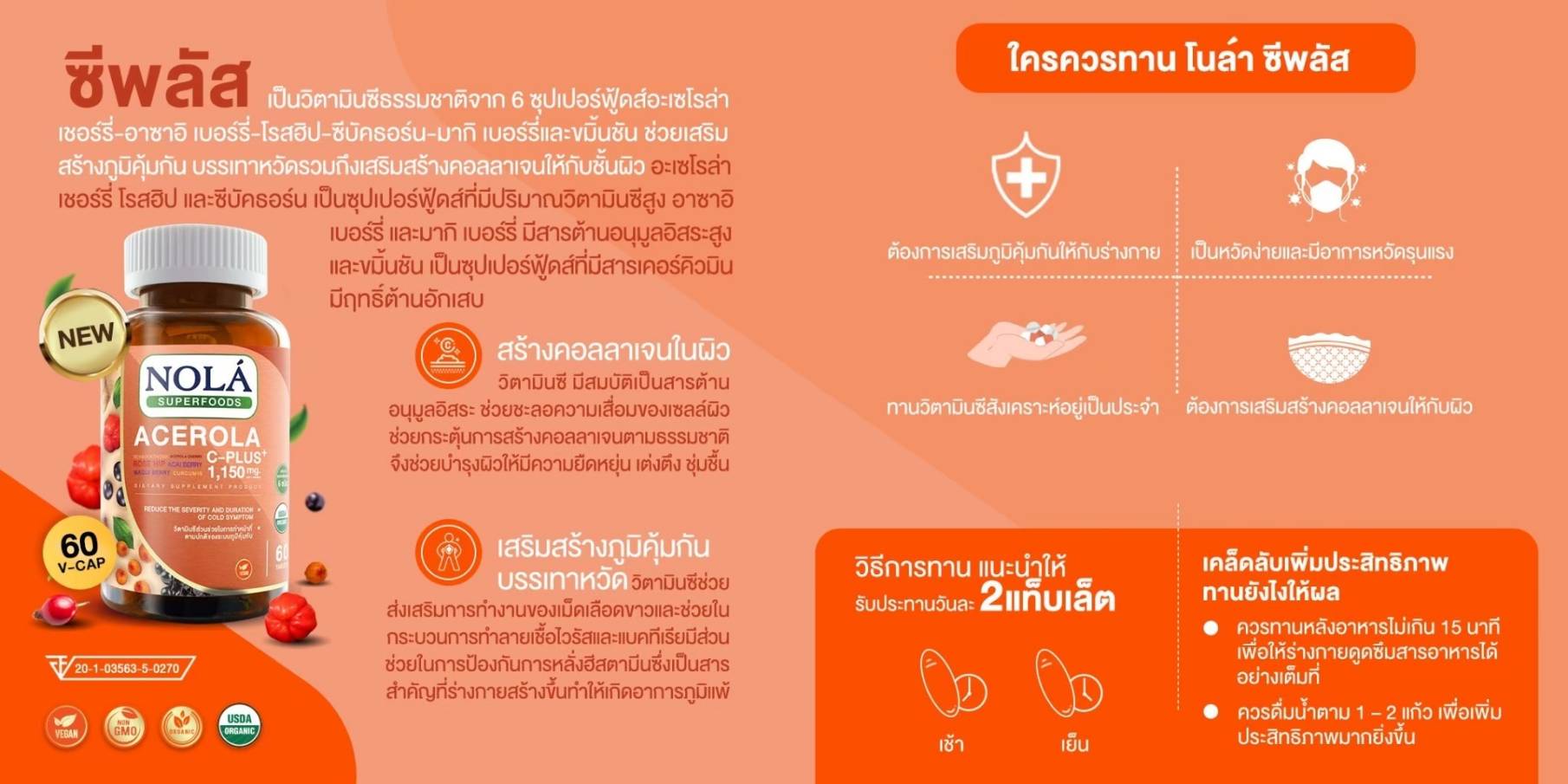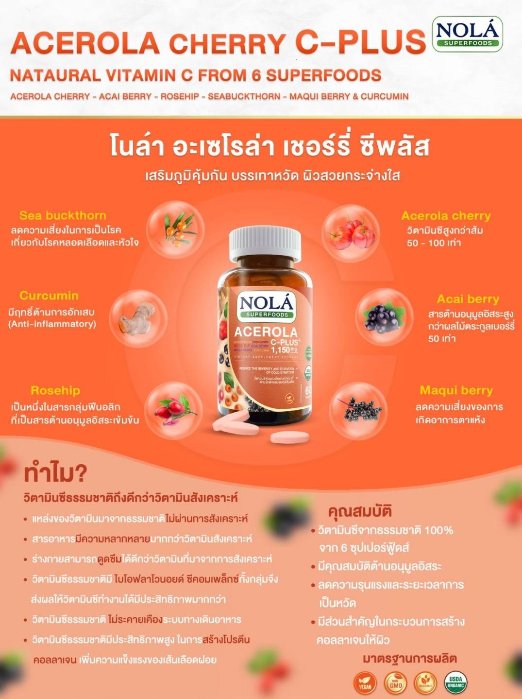โนล่า ซีพลัส วิตามินซีธรรมชาติจาก 6 ซุปเปอร์ฟู้ดส์ ซึ่งมีปริมาณวิตามินซีสูงกว่าส้มถึง 50 เท่า มีสารต้านอนุมูลอิสระสูงจากอาซาอิ เบอร์รี่ และมากิ เบอร์รี่ รวมถึงมีฤทธิ์ต้านอักเสบจากเคอร์คิวมินที่เป็นสารสกัดจากขมิ้นชัน