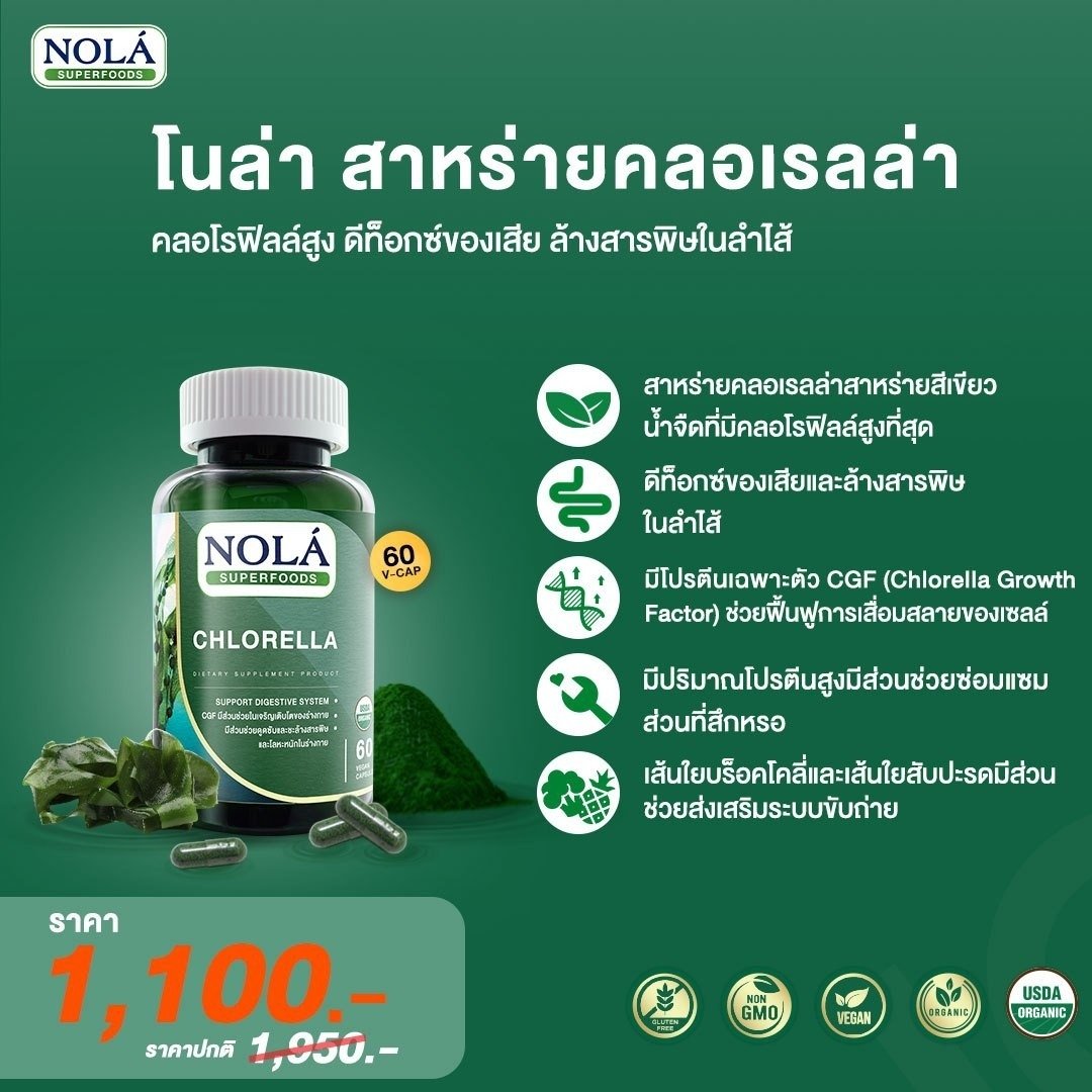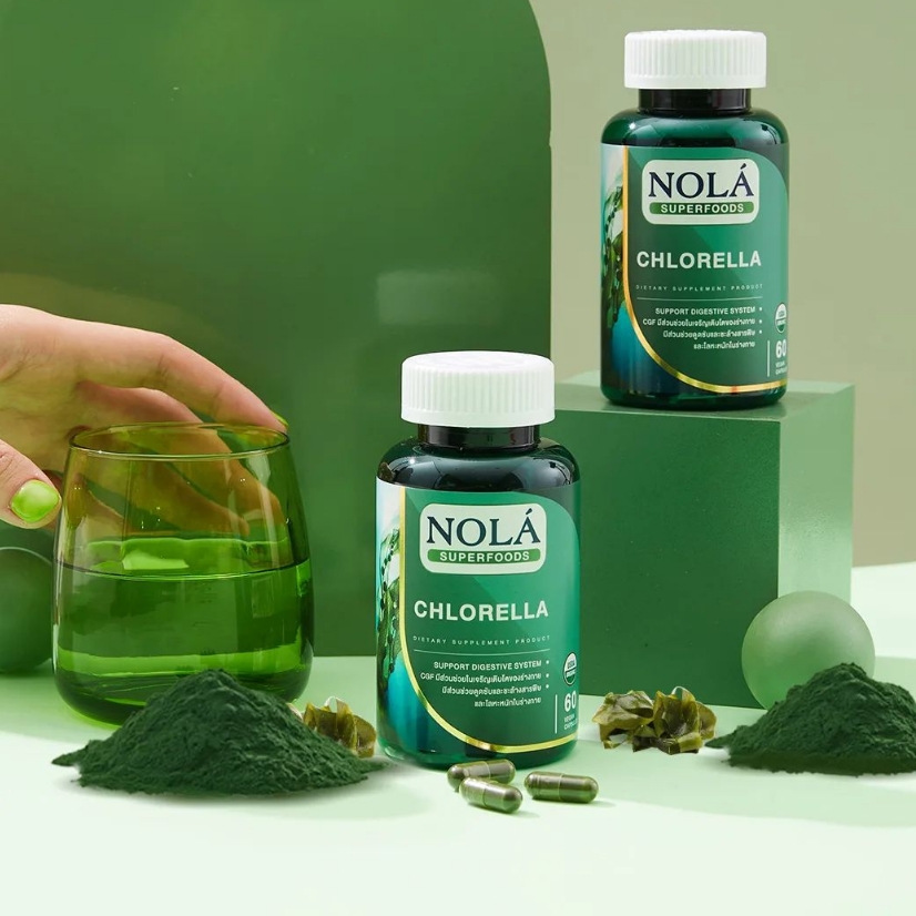NOLA Chlorella หรือ สาหร่ายคลอเรลลา เป็นสาหร่ายสีเขียวเซลล์เดียว ที่สามารถพบได้ในแหล่งน้ำจืดที่มีระบบนิเวศน์ที่สมบูรณ์ สะอาด และอากาศบริสุทธิ์เท่านั้น สาหร่ายคลอเรลลาอุดมไปด้วยสารอาหารต่างๆ โดยในสาหร่ายคลอเรลลานั้นเป็นแหล่งของคลอโรฟิลล์ชั้นดี ซึ่งมีส่วนช่วยในการชะล้างสารพิษในระบบทางเดินอาหาร รวมถึงยังเป็นแหล่งของโปรตีน ซึ่งมีปริมาณสูงถึง 60% และยังประกอบไปด้วยกรดอะมิโนทั้ง 20 ชนิด รวมทั้งกาบ้า โอเมก้า-3 และโอเมก้า-6 และอุดมไปด้วยวิตามิน แร่ธาตุ และเส้นใยอาหาร เช่น วิตามิมเอ วิตามินบี 1, 2, 6 และ 12 วิตามินซี และวิตามินอี ธาตุเหล็ก แม็กนีเซียม ซิงค์ ลูทีน และเบต้า-แคโรทีน เป็นต้น
